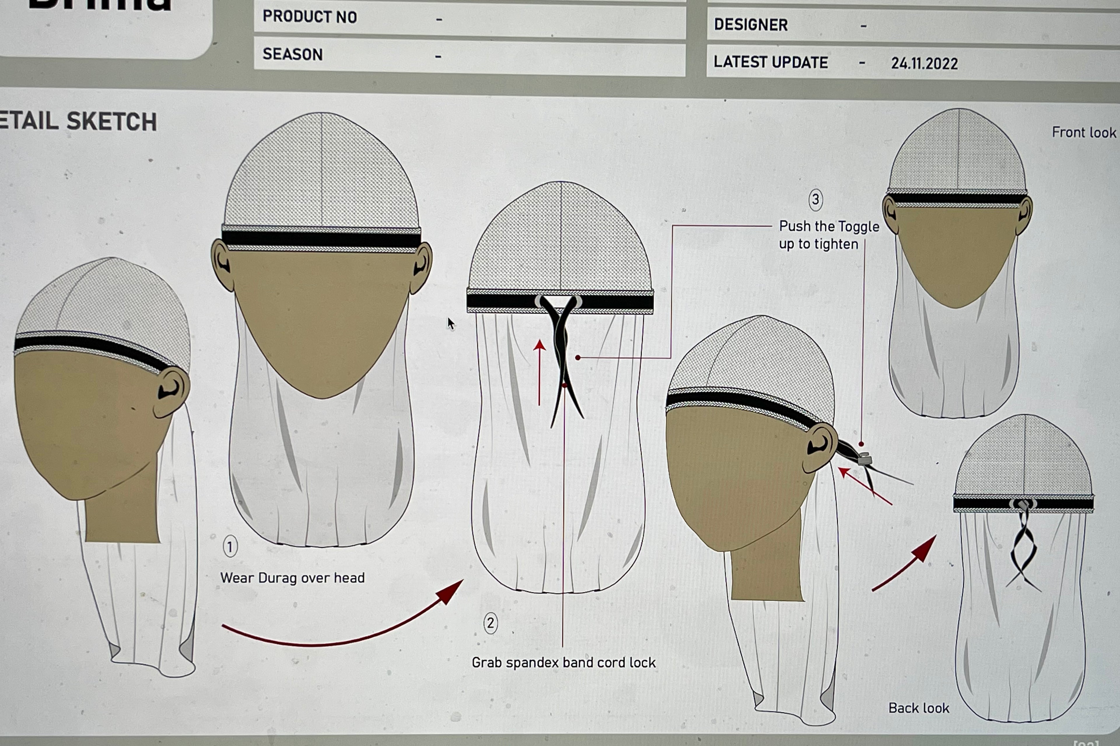 After several design modifications, the performance durag sample #1 was ready for test